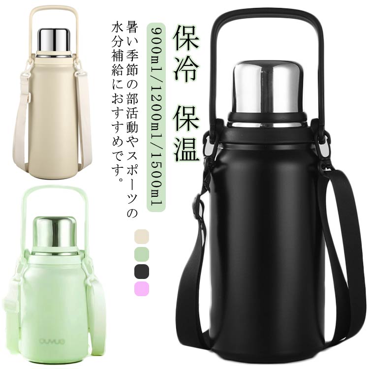 水筒 スポーツドリンク対応 スポーツドリンク コップ付き 真空断熱 ステンレスボトル 保温 保冷 マグボトル ハンドル付 持ち手付 ショルダーストラップ 大容量 広口 洗いやすい 女性