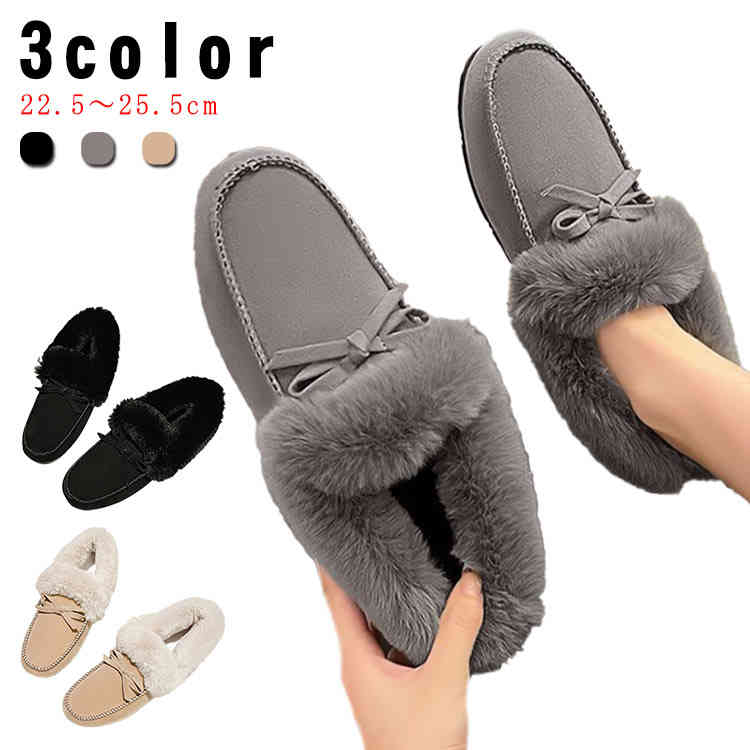 モカシンシューズ ファー付き モカシン スリッポン モコモコ レディース 靴 暖か カジュアルシューズ