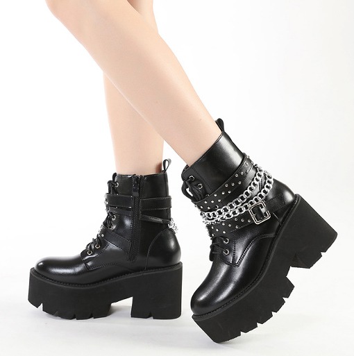 ブーツ 厚底 切り替え 太いヒール 無地 スタッズ リベット付 系 原宿系ファッション 韓国風 ダンス衣装 カワ 個性 奇抜 かわいい 青文字系 美足 脚長 シューズ 靴 レディース
