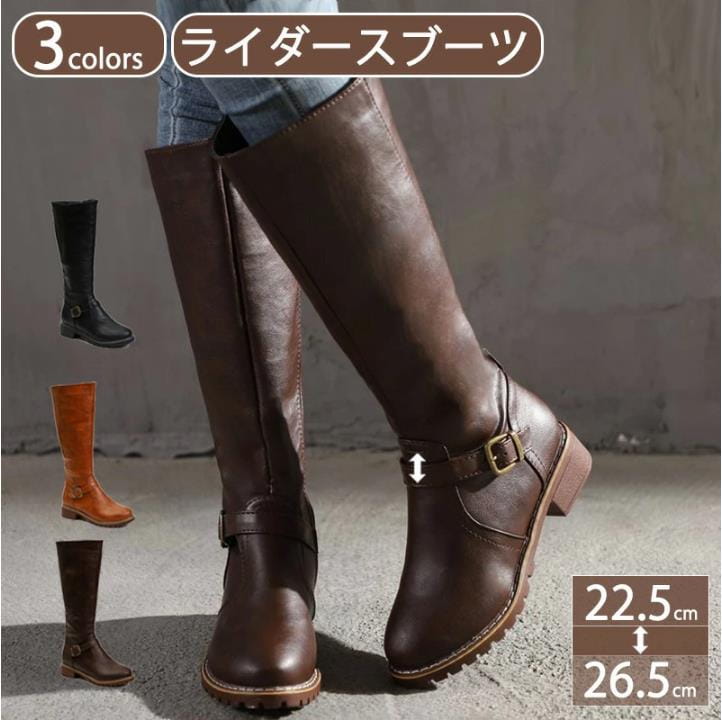 ロングブーツ ロング丈 レディース フラットシューズ シンプル 美脚 サイドベルト フルジッパー ローヒール ジョッキーブーツ ロングエンジニアブーツ 大人上品 シンプルデザイン ヒール 黒 靴 新作
