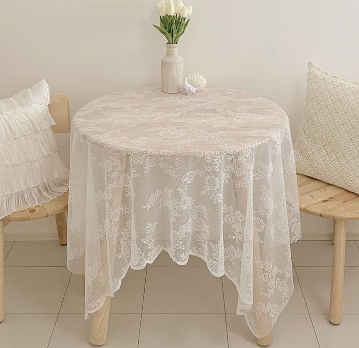 テーブルクロス花柄レース刺繍白ホワイトフレアフリルフラワー北欧韓国おしゃれ雑貨アンティーク布かわいいピクニックシートカフェマット四角長方形75cm×140cm100cm×145cmレトロ生地背景可愛い