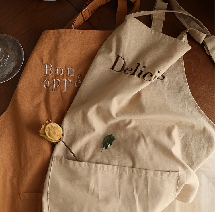 コットンロゴ刺繍エプロン5色ロングリボンシンプル韓国北欧ベージュブラウンオレンジ青ブルーグリーンミドリおしゃれ可愛いナチュラルカフェ前掛け大人綿レディースキッチン首かけポケット