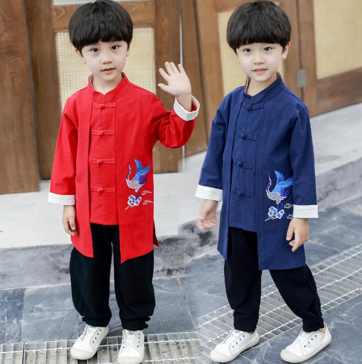 チャイナ 子供服 2点セット表演服 カンフー 太極拳 服 ウェア 男の子 演武服 演武服 チャイナ 太極ウェア 長袖 長拳 伝統拳 気功 前開き 鶴 学園祭