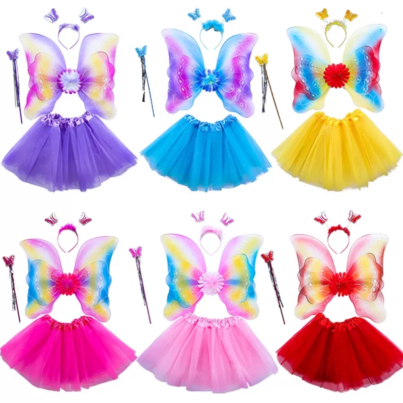 子供 羽 羽根 妖精 蝶 コスチューム 衣装 仮装 スカート付 スカート ステッキ カチューシャ 余興 ダンス 文化祭 学園祭 仮装用 変装 パーティー 4点セット