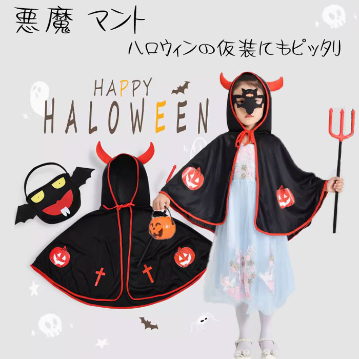 コスプレ衣装として評価の高い人気の悪魔マント 悪魔の角&カボチャ手提げが沢山付いた可愛いデザインが特徴です♪