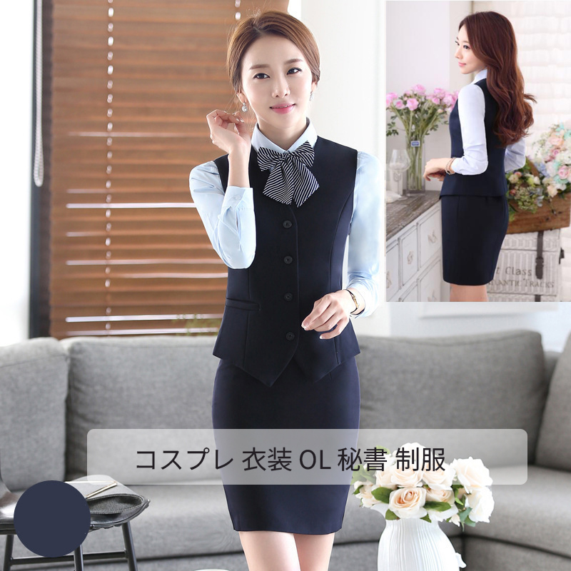 コスプレ 衣装 OL 秘書 制服 オフィスレディ スーツ セクシーコス ベスト&ミニスカの可愛い首リボン付きOL、秘書コスチュームセット ミニスカ セール
