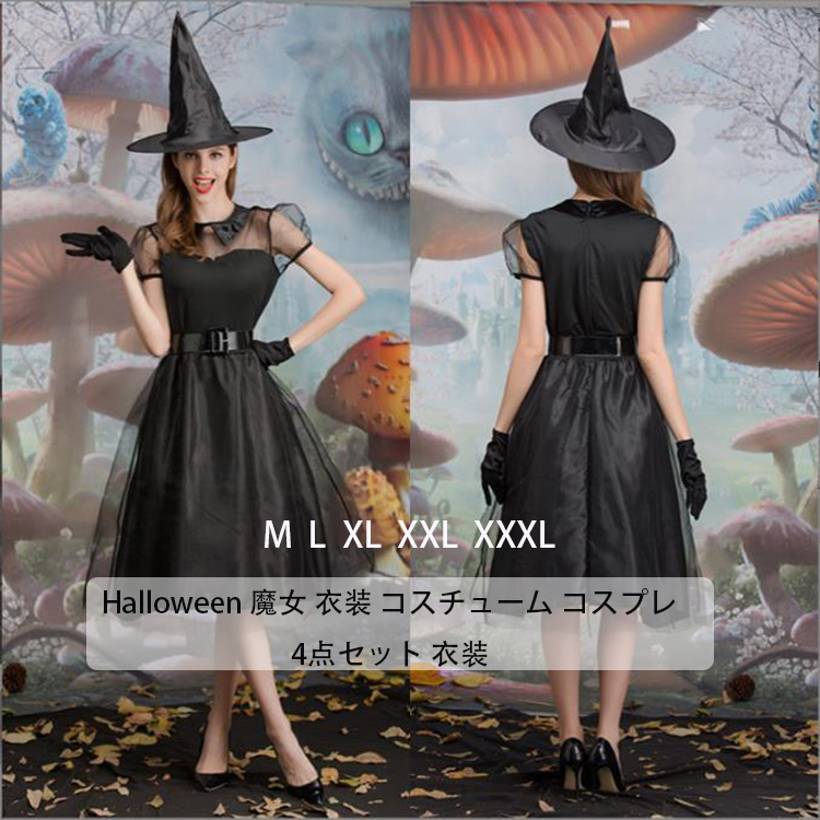 ハロウィン衣装 レディース 女性 cosplay ハロウィン Halloween 魔女 衣装 コスチューム コスプレ セット 衣装 手袋 ワンピース ベルト 帽子 演出 パーティー 舞