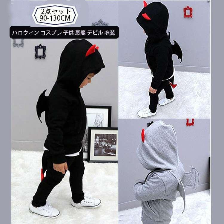 ハロウィン 衣装 コスプレ 子供 悪魔 デビル 衣装 仮装 男の子 可愛い キッズ 女の子 ブラック 上下セット パーカー グレー なりきり スウェット 変身