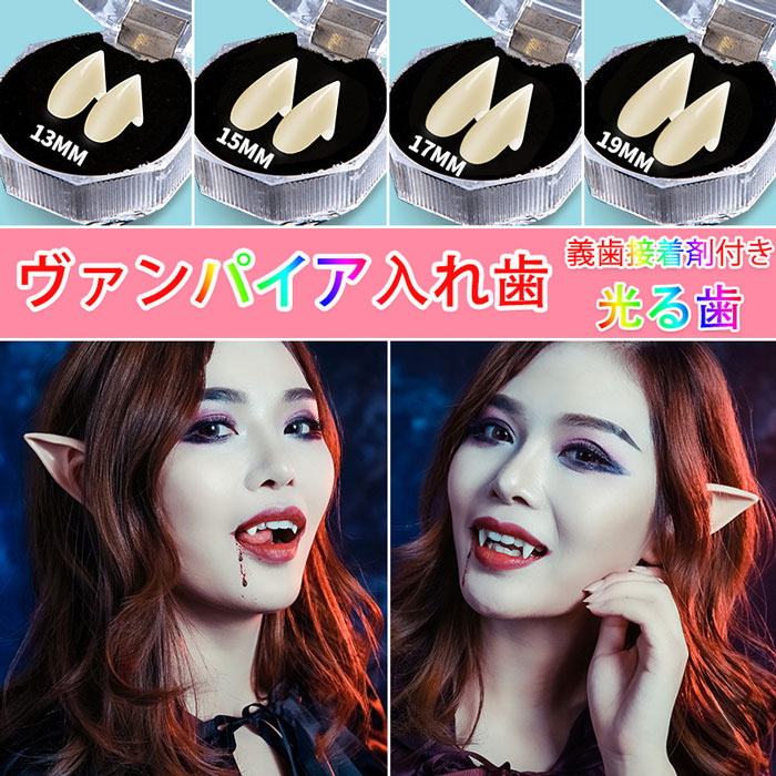 [義歯接着剤付き 4本セット】 バンパイアの牙 光る歯 ハロウィン 入れ歯セット 4本セット コスプレ つけ歯 吸血鬼のつけ牙 仮装 ヴァンパイア 男女兼用