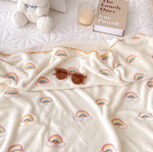 虹柄ブランケットひざ掛け110cm×150cm刺繍もこもこふわふわ韓国雑貨北欧大きいおしゃれ可愛い子ども大人大判厚手シングル毛布軽量暖かいベッドソファー椅子白ホワイトインテリアレインボー雲虹色カラフル