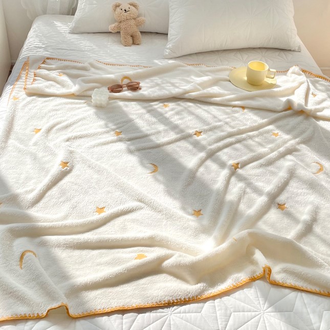 星柄ブランケット2色ひざ掛け110cm×150cm月星スター刺繍もこもこふわふわ韓国雑貨北欧大きいおしゃれ可愛い子ども大人大判厚手シングル毛布軽量暖かいベッドソファー椅子白グレーブルーホワイトインテリ