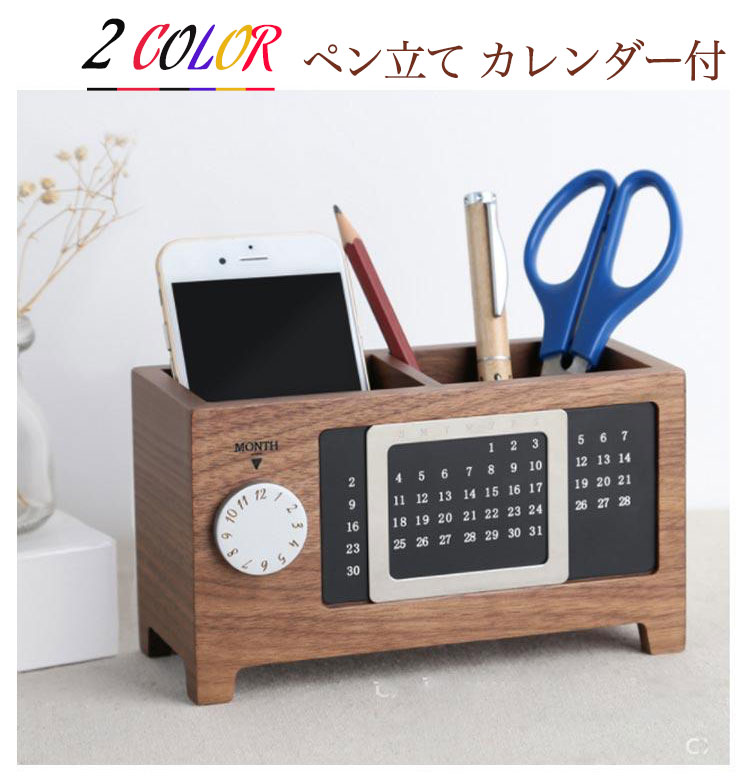ペン立て 木製 ナチュラル系 万年カレンダー付き デスク収納 卓上収納 ペンスタンド 収納 おしゃれ 整理整頓 小物収納