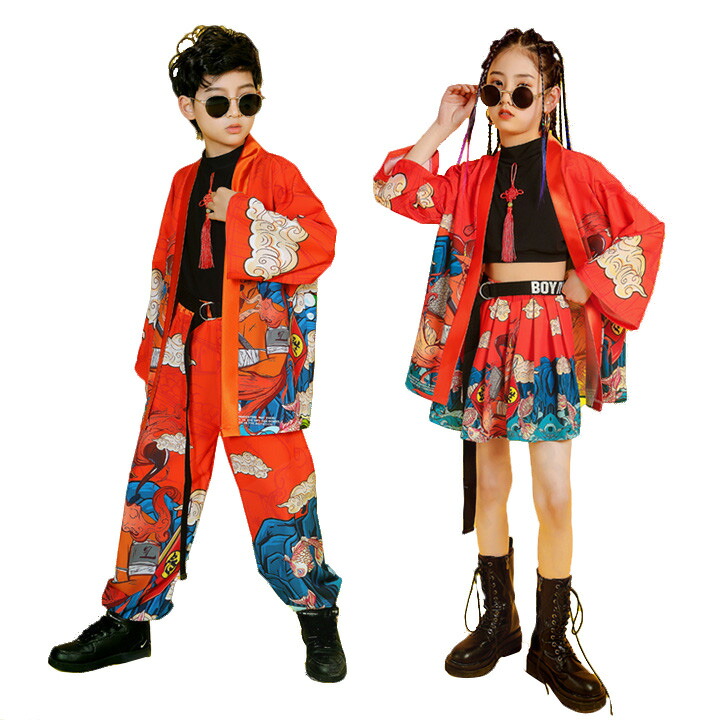 子供ダンス衣装 セットアップ 大人サイズ 黒 赤 おしゃれ 中華風 ダンスウェア 子供服 4点セット 女の子 男の子 学生ダンス 長袖 スカート Hiphop 演出 応援ダンス 舞台 団体注文 発表会