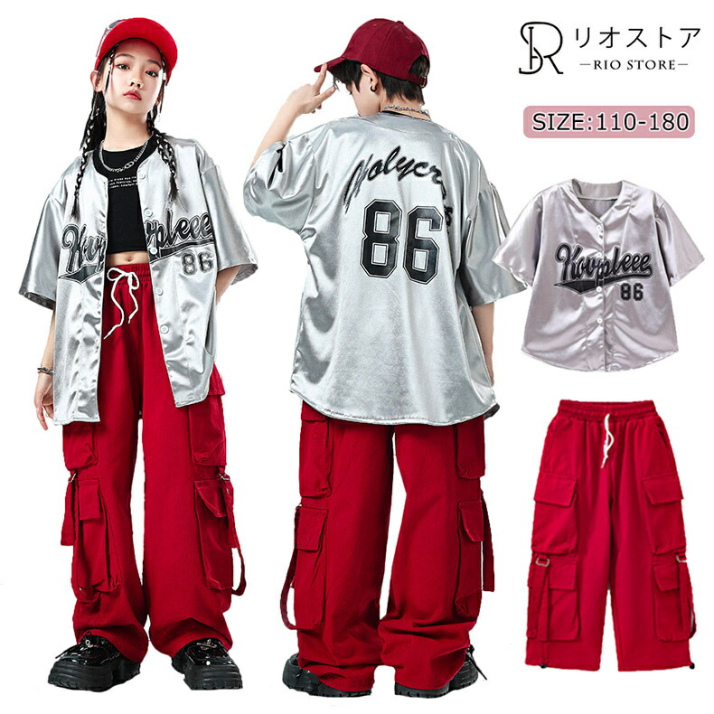 子供ダンス ヒップホップファッション シルバーベースボールシャツ 赤パンツキッズ ベビー マタニティ キッズファッション スーツ カジュアルセットアップ カジュアルパンツセット