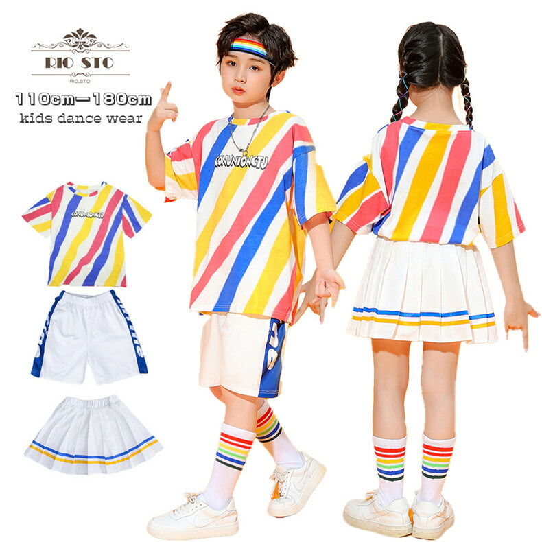 子供ダンス衣装 男の子 女の子 虹色Tシャツ 半袖シャツ 短パン キッズ 子供服 学生 2点セット セットアップ 夏用 おしゃれ 子供服 発表会 キッズダンス ヒップホップ ダ