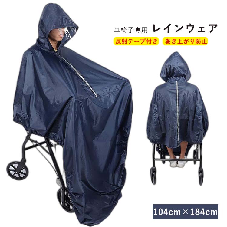 レインコート 車いす ポンチョタイプ 裾ゴム 巻き上がり防止 合羽 反射テープ付き 防水 透明バイザー 視界良好 高齢者 お年寄り ネイビー 雨合羽 着脱容易 フリーサイズ