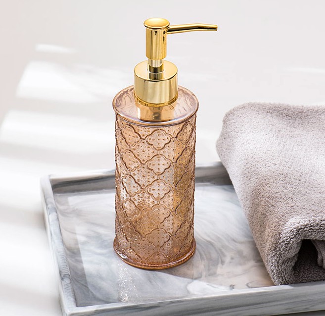詰め替えボトルホルダークリア透明韓国雑貨インテリア北欧おしゃれ洗面所浴室シャンプーリンスハンドソープアルコール容器収納四角大容量ソープ化粧品レトロ花柄フラワーブラウンガラスゴールド高級感大きい