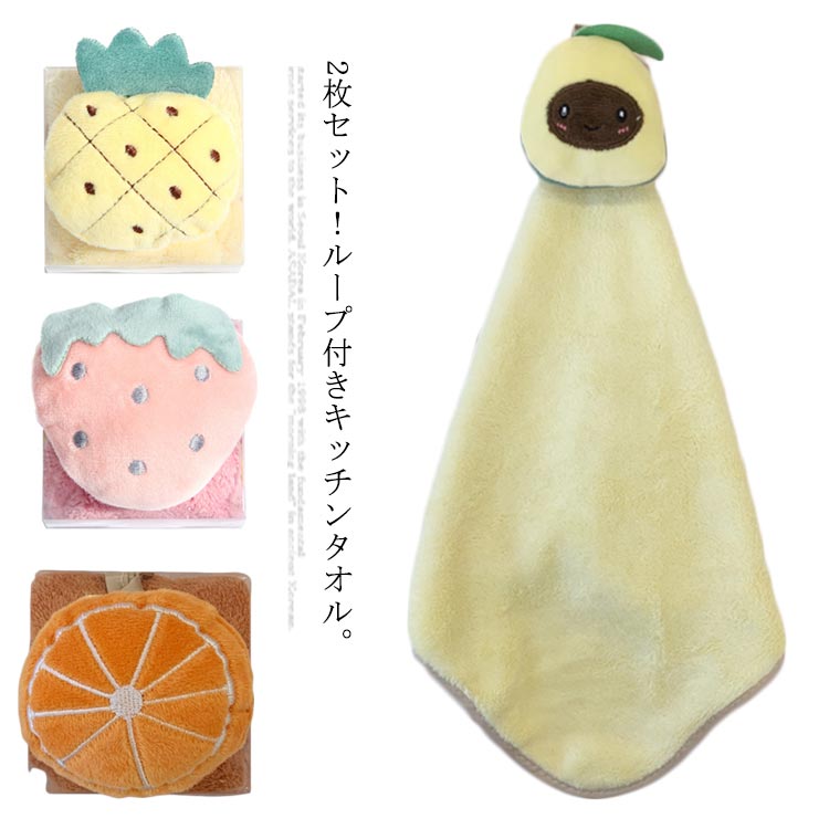 ループ付きタオル キッチンタオル 同色2枚セット かわいい ループタオル 吸水 速乾 おしゃれ フルーツ ハンドタオル 手拭きタオル 洗面所