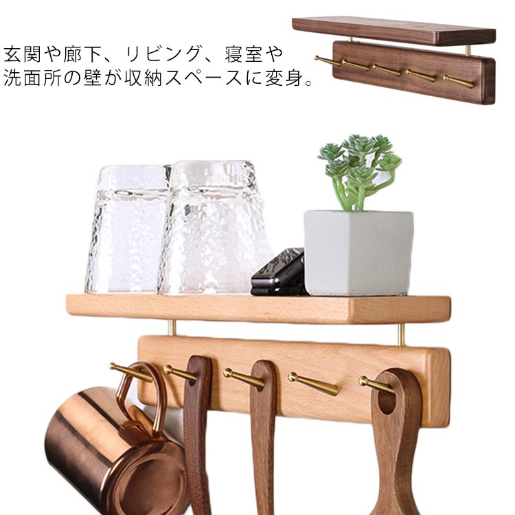 ウォールシェルフ 壁掛け棚 壁面収納 ウォールラック ウッド シェルフ 棚 玄関 ラック コート掛け かばん掛け 鍵かけ フック付き ハンガー付き 落下防止