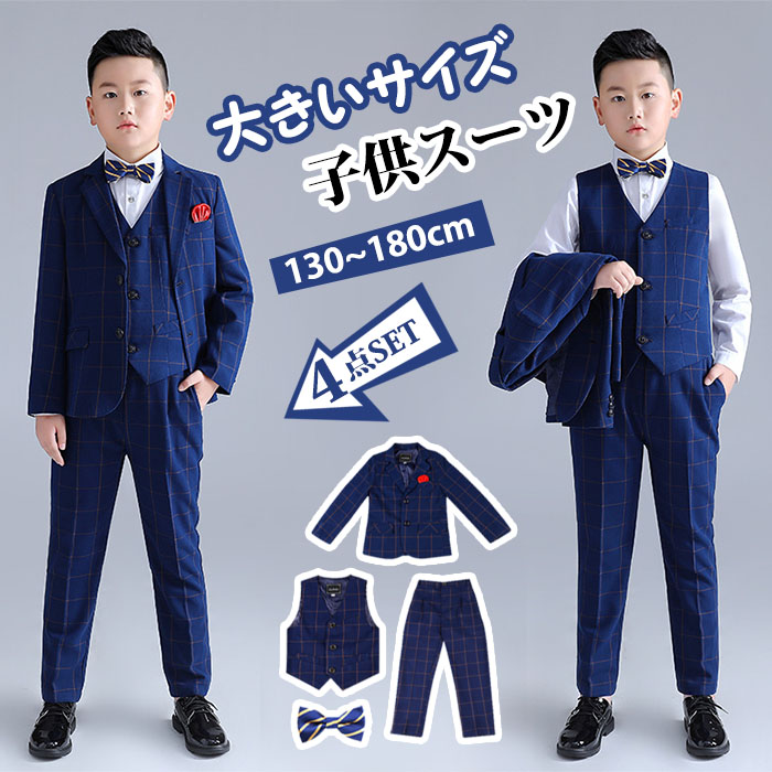 ゆったりサイズ体 男の子 スーツ 160 170 180 男の子スーツ4点セット 卒業式 入園式 子供服 タキシード 発表会 男の子 結婚式 ジュニア 長袖ジャケット ベスト ズボン チェック柄
