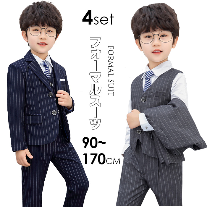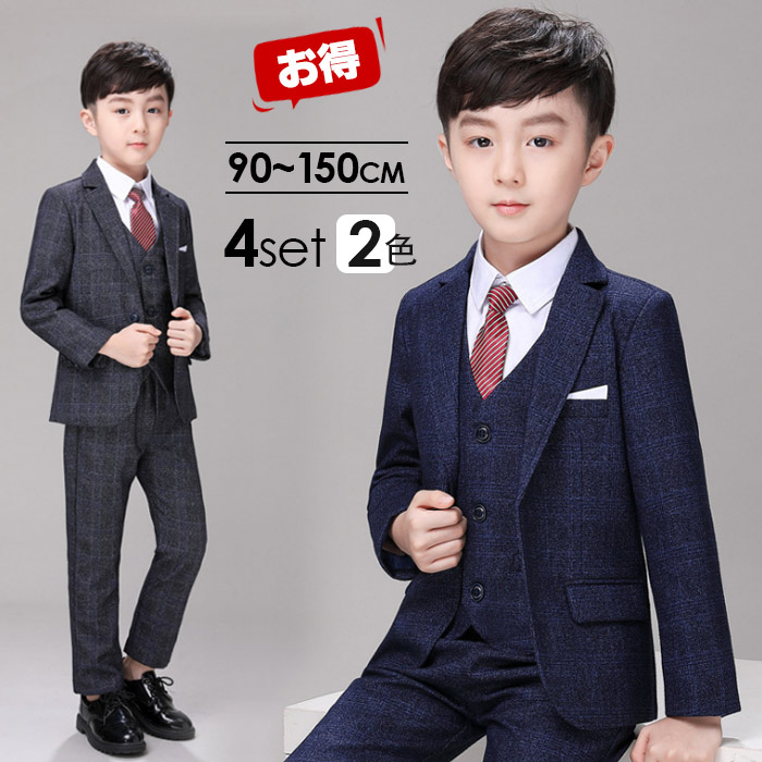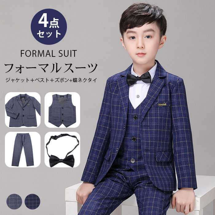男の子 スーツ 150 男の子スーツ4点セット 卒業式 入園式 子供服 タキシード 発表会 男の子 結婚式 ジュニア 長袖ジャケット ベスト ズボン チェック柄
