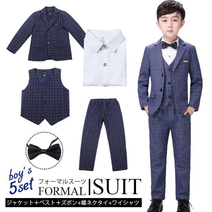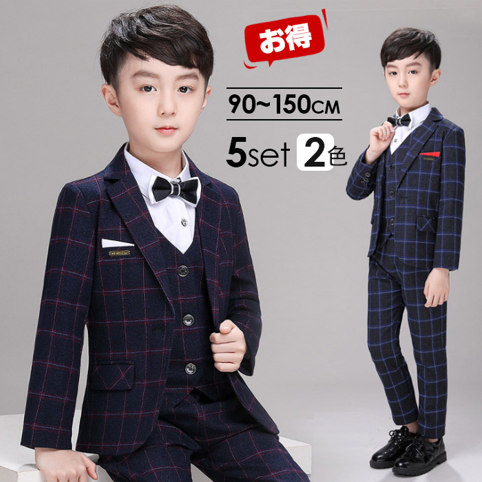 男の子 スーツ 150 男の子スーツ5点セット 卒業式 入園式 子供服 タキシード 発表会 男の子 結婚式 ジュニア 長袖ジャケット ベスト ズボン チェック柄