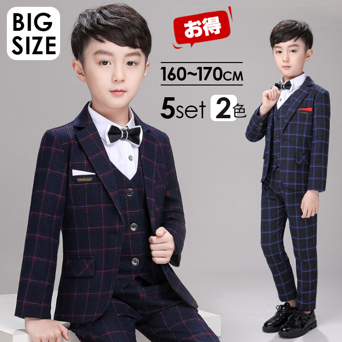 男の子 スーツ 160 男の子スーツ5点セット 卒業式 入園式 子供服 タキシード 発表会 男の子 結婚式 ジュニア 長袖ジャケット ベスト ズボン チェック柄
