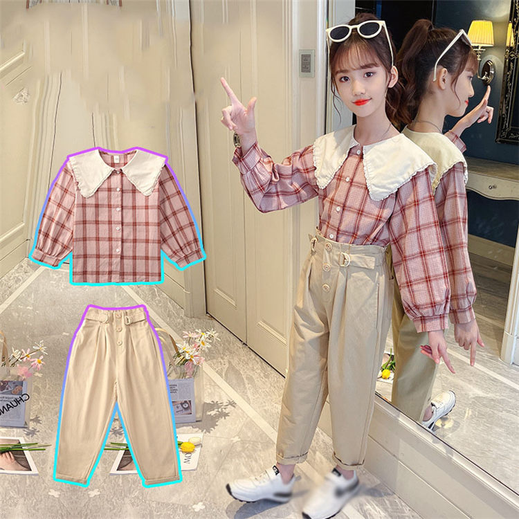 セットアップ 二点セット チェックシャツ+ズボン 海軍の襟 長袖 春秋 きれいめ 子供服 おしゃれ キッズ カジュアル 結婚式 女の子 洋装 お出かけ 120-170 可愛い パーティー グリーン ベ