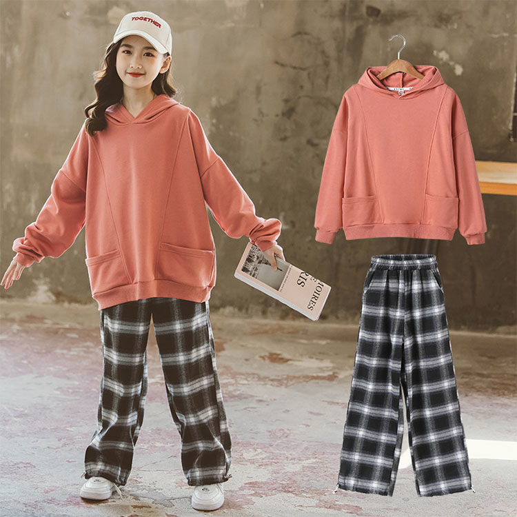 二点セット 上下セット 長袖 フード付き スウェット+ワイドパンツ チェックズボン おしゃれ 子供用 女の子 春 秋 おしゃれ お出かけ 通園 可愛い 女児 キッズ 通学 卒業式 小学生 オレンジ 1