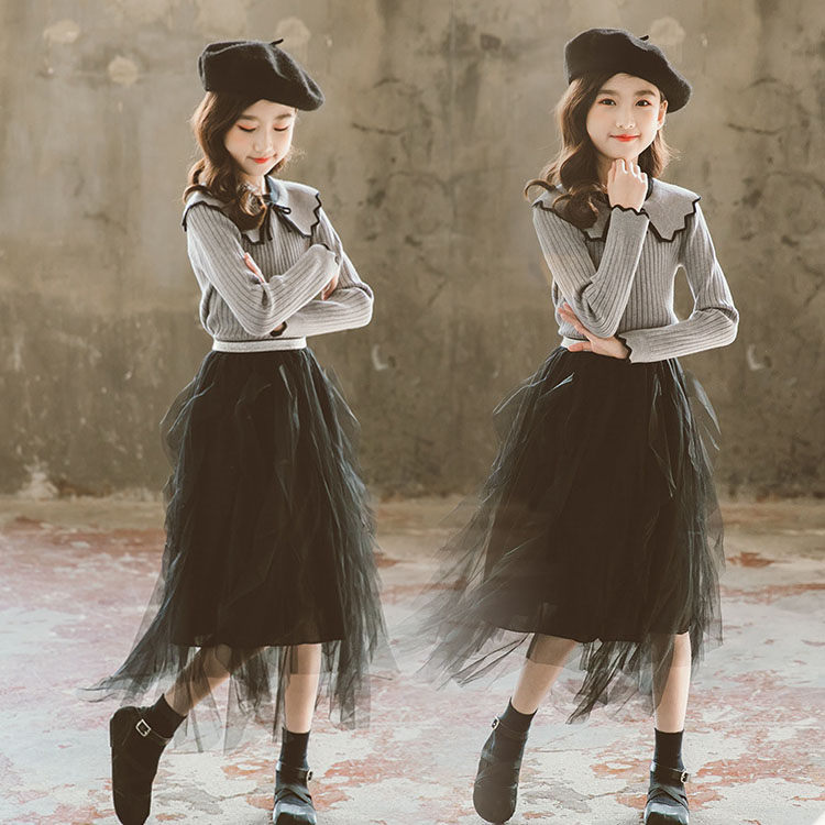 スカートセット キッズ 子供服 Aライン 女の子 ラペル グレーセーター ブラックチュールスカート ファッション きれいめ お嬢様風 結婚式 おしゃれ 女児 可愛い お出かけ パーティー 学生 110