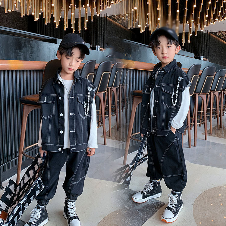 三点セット 春秋 長袖 スウェット+ベスト+長ズボン デニム キッズ 男の子 カジュアル ブラック お出かけ カッコイイ リッラクス 運動 110-170 -1040