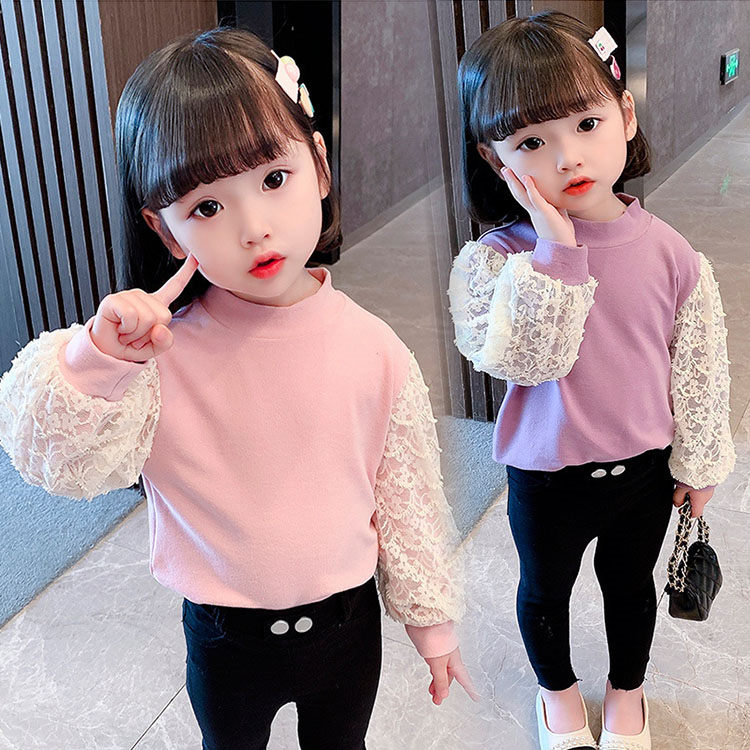 Tシャツ キッズ 春秋 長袖 レーススリーブ モックネック 子供用 女の子 ラウンドネック ファッション きれいめ お嬢様風 結婚式 おしゃれ 女児 可愛い お出かけ パーティー 学生 ピンク パープ