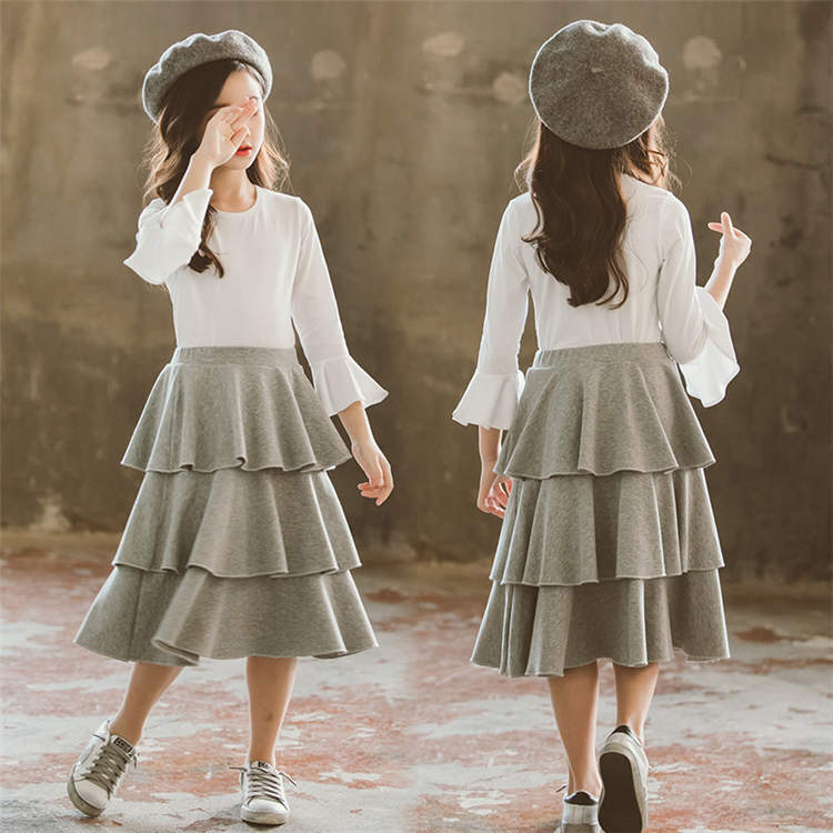 ティアードスカート シャツ キッズ 子供ドレス 子供服 キッズドレス ホワイト グレー ロングスカート ミモレ丈 秋物 春 秋