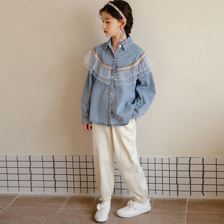 二点セット 子供服 ポリエステル 上品 上下セット 長袖 デニムシャツ おしゃれ 長ズボン 子供用 女の子 ストライプ 春 秋 おしゃれ お出かけ 通園 可愛い 女児 キッズ 通学 卒業式 小学生 1
