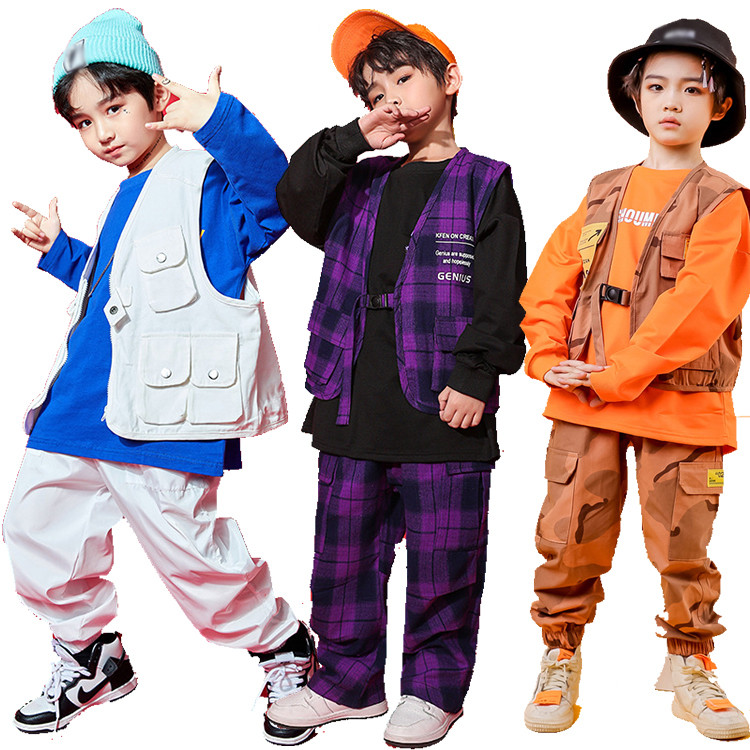 二点セット ベスト+パンツ キッズダンス衣装 セットアップ ストリート 原宿系 チェック柄 迷彩パンツ ヒップホップ 男女兼用 トップス 子供服 ダンス衣装 派手 ダンスウェア ジャズ hiphop