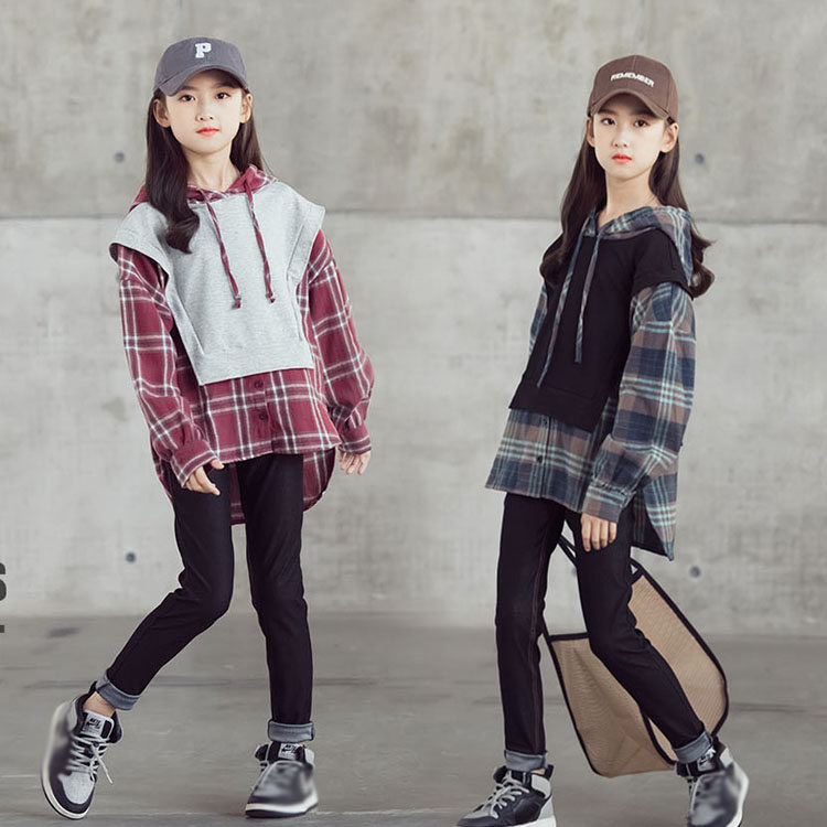 二点セット 上下セット 長袖 フード付き スウェット+長ズボン チェック おしゃれ 子供用 女の子 春 秋 おしゃれ お出かけ 可愛い 女児 キッズ 通学 卒業式 小学生 格子 110-160 -