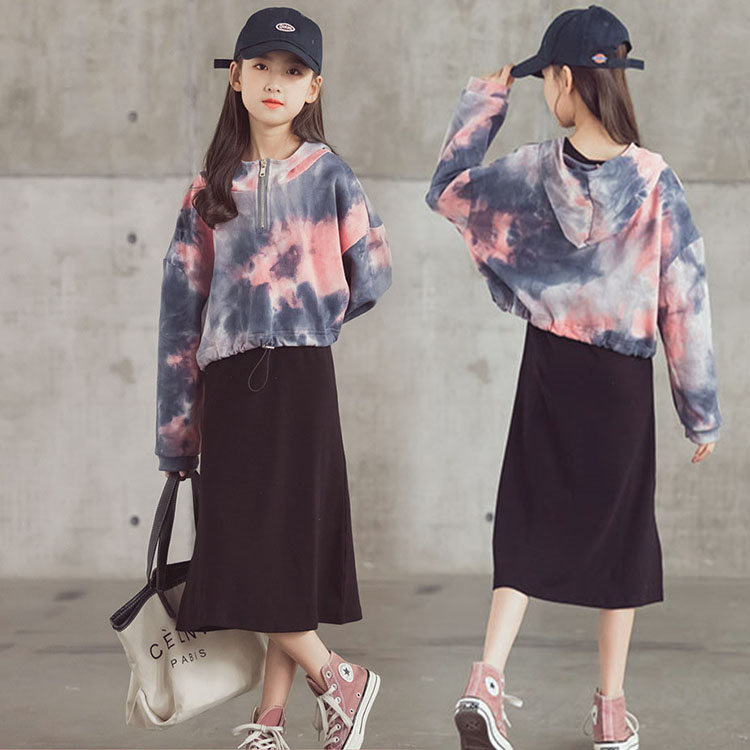 二点セット キッズ 長袖+ワンピース フード付き 子供服 女の子 ファッション きれいめ 結婚式 カジュアル おしゃれ 女児 プリント 可愛い お出かけ パーティー 学生 130-165 TZ-100