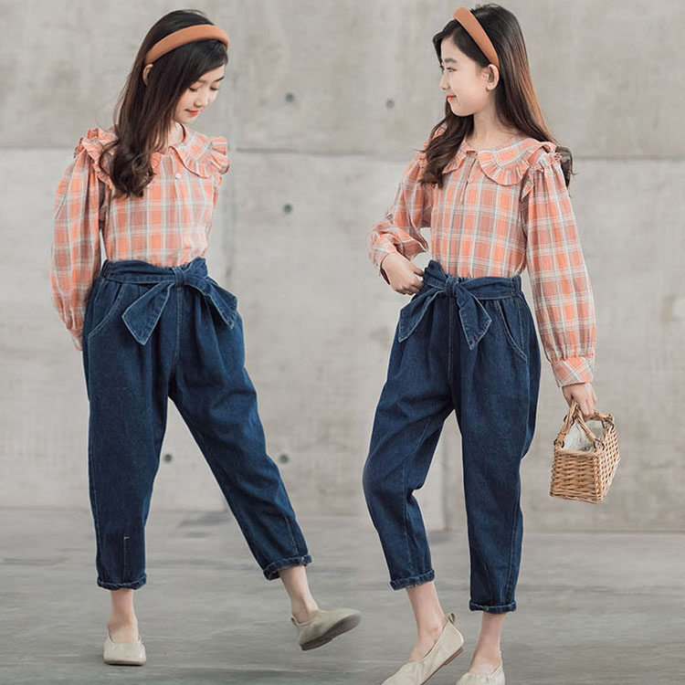 二点セット キッズ 子供服 女の子 シャツ+デニムパンツ ファッション きれいめ 結婚式 カジュアル おしゃれ 女児 格子 可愛い お出かけ パーティー 学生 130-165 チェック TZ-1009