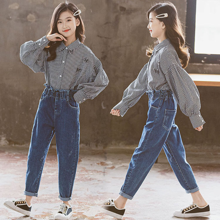 二点セット キッズ 子供服 女の子 シャツ+デニムパンツ ファッション きれいめ 結婚式 カジュアル おしゃれ 女児 格子 可愛い お出かけ パーティー 学生 130-165 チェック -1009