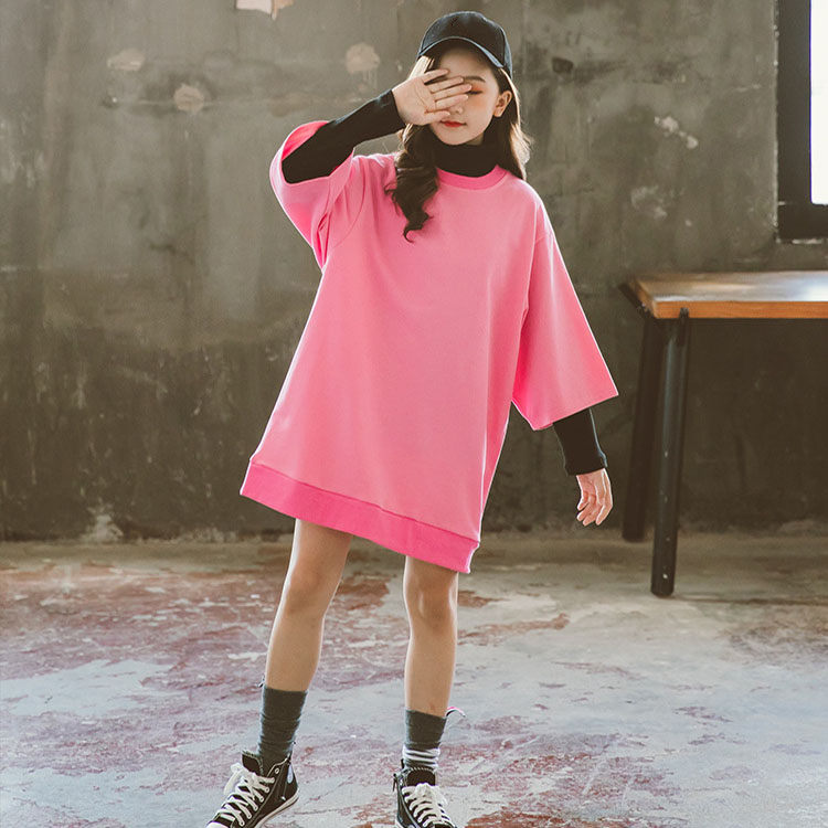 スウェット ミディアム丈 七分袖 ピンク キッズ おしゃれ 子供用 女の子 春 秋 おしゃれ お出かけ 可愛い 女児 通学 小学生 110-160 丸首 カジュアル 運動 スポーツ -996