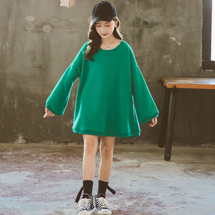 スウェット グリーン ミディアム丈 長袖 キッズ おしゃれ 子供用 女の子 春 秋 おしゃれ お出かけ 可愛い 女児 通学 卒業式 小学生 110-160 丸首 カジュアル 運動 TZ-996