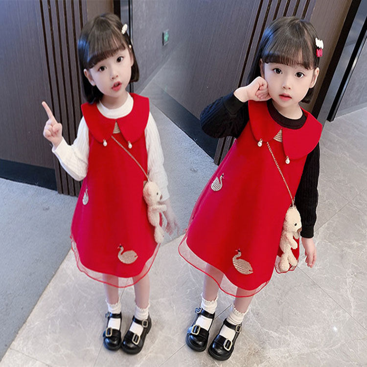 二点セット キッズ セーター+レッドジャンパースカート ホワイト ブラック ラペル アヒル柄 子供服 女の子 ファッション きれいめ 結婚式 カジュアル おしゃれ 女児 可愛い お出かけ 80-130