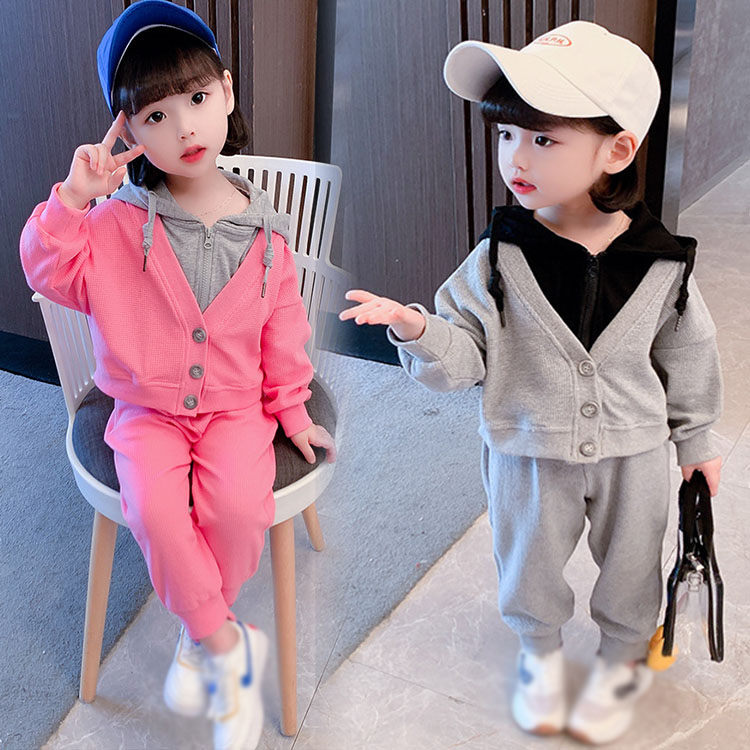 二点セット キッズ スウェット+長ズボン フード付き フェイク 子供服 女の子 ファッション きれいめ 結婚式 カジュアル おしゃれ 女児 可愛い お出かけ ピンク グレー 80-130 -105