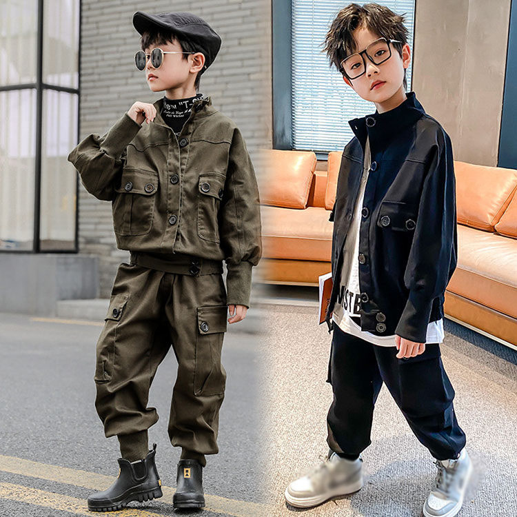 二点セット 春秋 長袖 ジャケット+長ズボン ブラック カーキ キッズ 男の子 カジュアル ブラック お出かけ カッコイイ リッラクス 運動 110-160 -1041