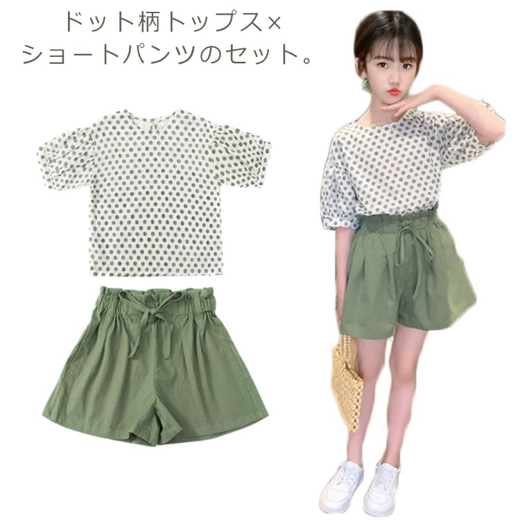子供服 キッズ セットアップ 女の子 半袖 上下セット ドット柄 tシャツ ショートパンツ セット リネン調 カジュアル おしゃれ 綿 コットン 夏 子供服 子ども服 こども トップス ショート ボト