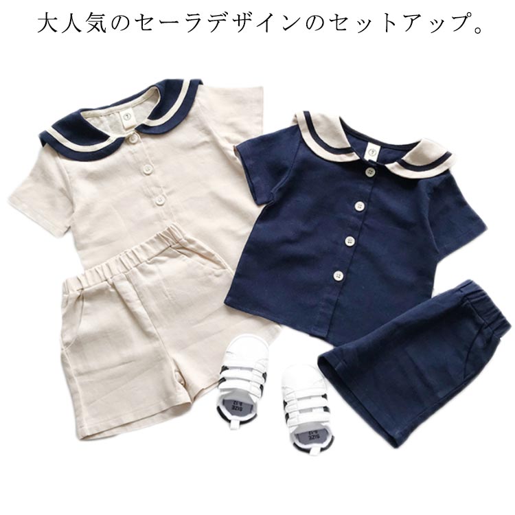 セーラー上下セット 半袖 綿 麻 男の子 女の子 マリン襟 ボタンシャツ 半ズボン 短パン ガールズ キッズ こども 子供服 双子 姉妹 兄弟 全2色