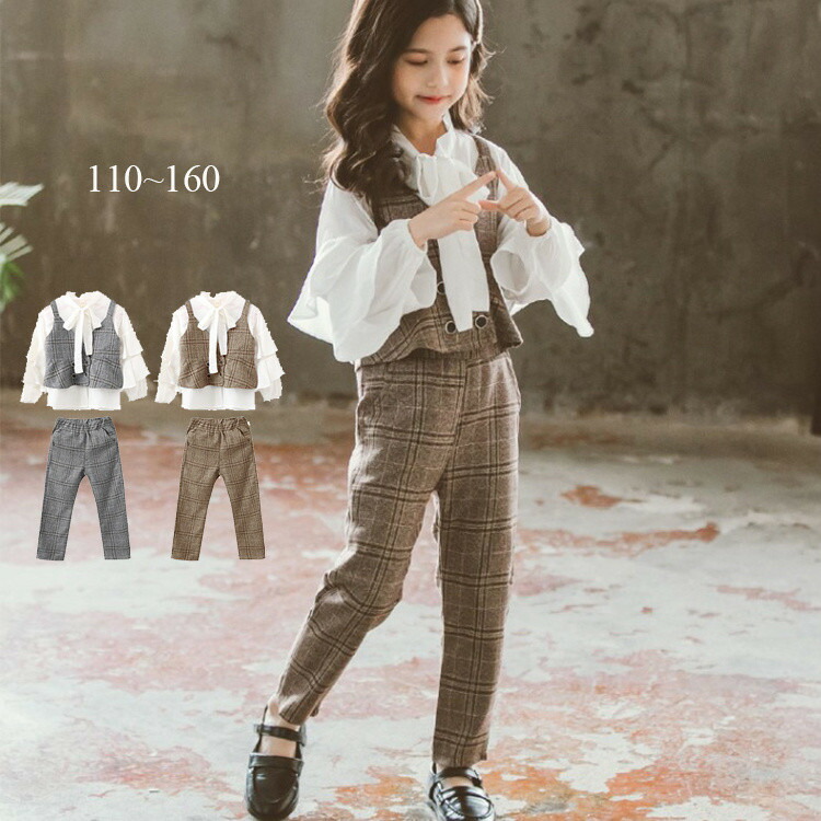 キッズ セットアップ 子供服 女の子 卒業式 パンツスーツ 3点セット シャツ リボン パンツ ベスト チェック 女の子 フォーマル 結婚式 発表会 入学式 スーツ 110 120 130