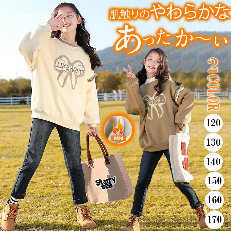 2カラー 6サイズ キッズトップス 裏起毛 刺繍 トレーナー 秋冬 重ね着風 キッズトレーナー 長袖 リボン プリント 刺繍文字 袖口リブ 普段着 暖かい あったか 冷え対策 女の子 ガーリー