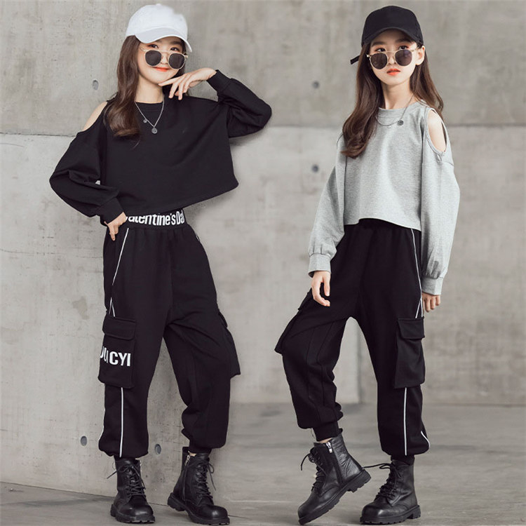 ダンス 衣装 キッズ ダンス衣装 ヒップホップ ステージ衣装 男の子 女の子 HIPHOP ダンス 原宿 肩だし ダンスウェア カジュアル Tシャツ 長袖スーツ ヒップホップ衣装 普段着