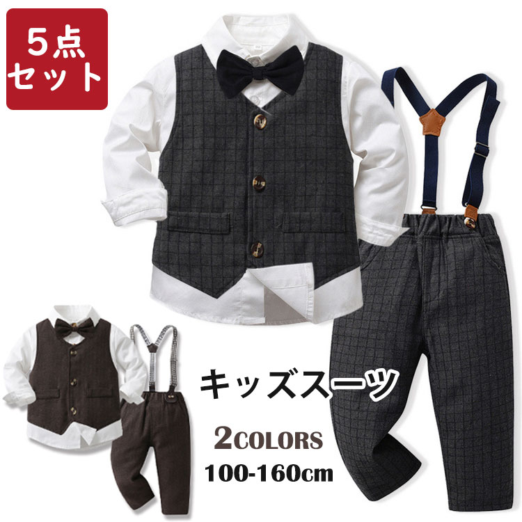 フォーマルスーツ 男の子 キッズ スーツ 5点セット 子供 スーツ 入園式 入学式 七五三 結婚式 発表会 ベスト シャツ パンツ サスペンダー 蝶ネクタイ タキシード 紳士服 お誕生日 パーティー